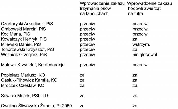 Można popaść w zadumę widząc, że posłowie z ugrupowań, których reprezentanci najczęściej odwołują się do wiary i wartości chrześcijańskich, manifestując swoją religijność, zgodnie głosowali przeciwko ustawie uwalniającej psy z łańcuchów i gwarantującej poprawę ich dobrostanu. Przy głosowaniu nad ustawą zakazującą hodowli zwierząt na furta tylko dwóch posłów z naszego okręgu, z grupy "konserwatywnej" poparło zmiany prawa.