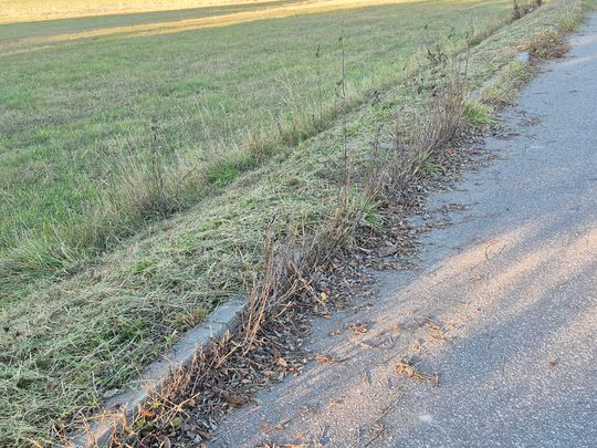 Jak widać, efekty dzisiejszych prac zleconych przez gminę naszej spółce są zaskakujące. Chaszcze skoszono po jednej stronie drogi, drugą pozostawiając nietkniętą. Koszenie wykonano niechlujne, pozostawiając badyle tuż przy asfalcie. W konsekwencji przy krawężnikach zalega coraz większe sterty piachu, suchych liści i chwastów. To nie wygląda dobrze, a przecież gmina za takie koszenie i utrzymanie drogi płaci.
