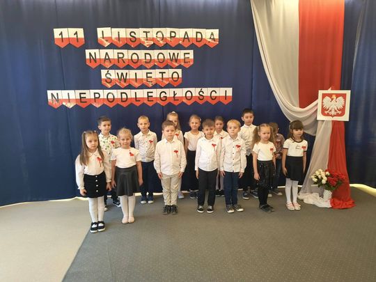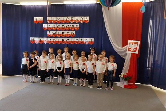 Z tej okazji dzieci z wszystkich grup oraz pracownicy przedszkola zebrali się, aby uroczyście świętować ten wyjątkowy dla Polaków czas. Wszyscy z powagą i w dużym skupieniu wysłuchali piosenek patriotycznych śpiewanych przez przedszkolaki. Po występach wszyscy razem odśpiewali hymn Polski " Mazurek Dąbrowskiego".