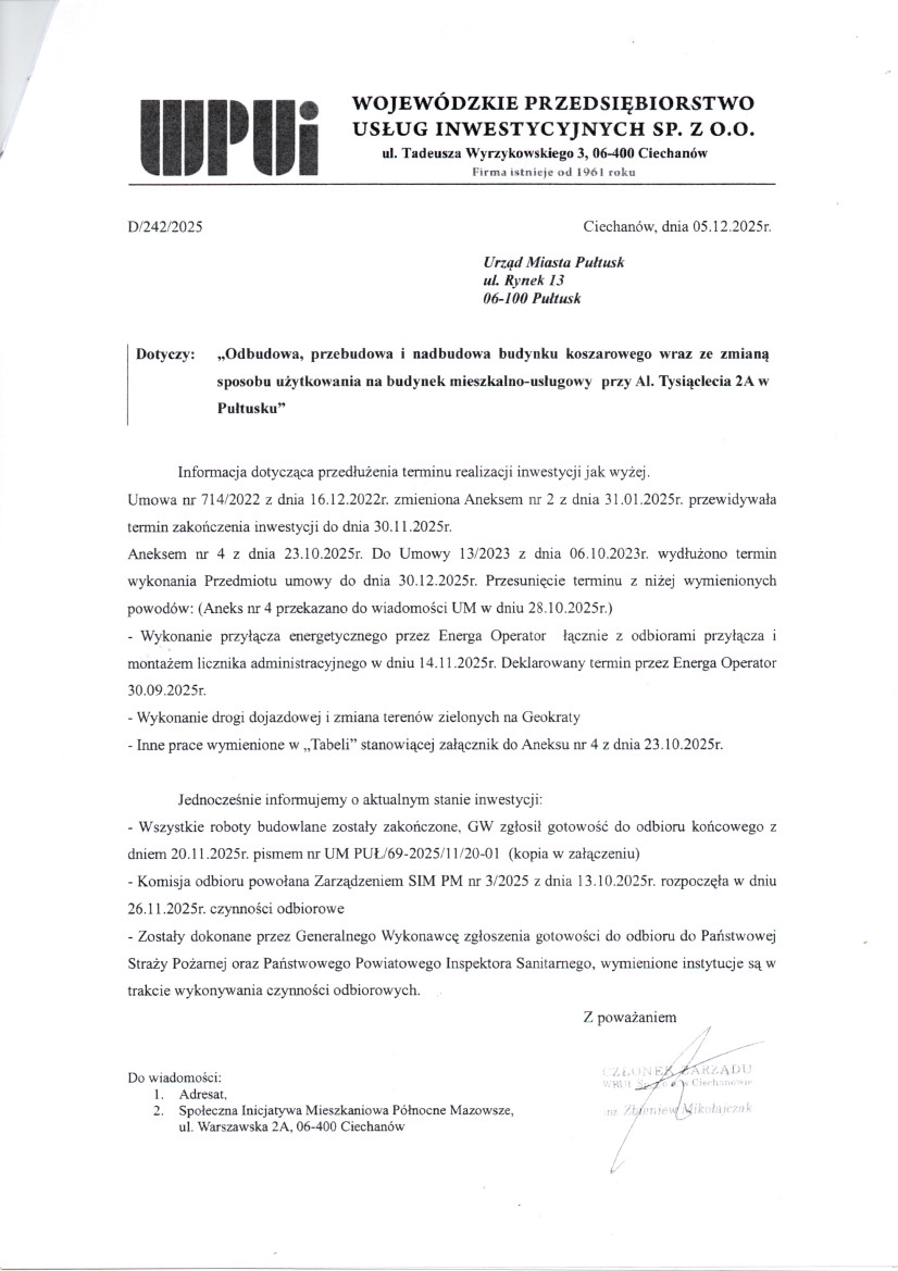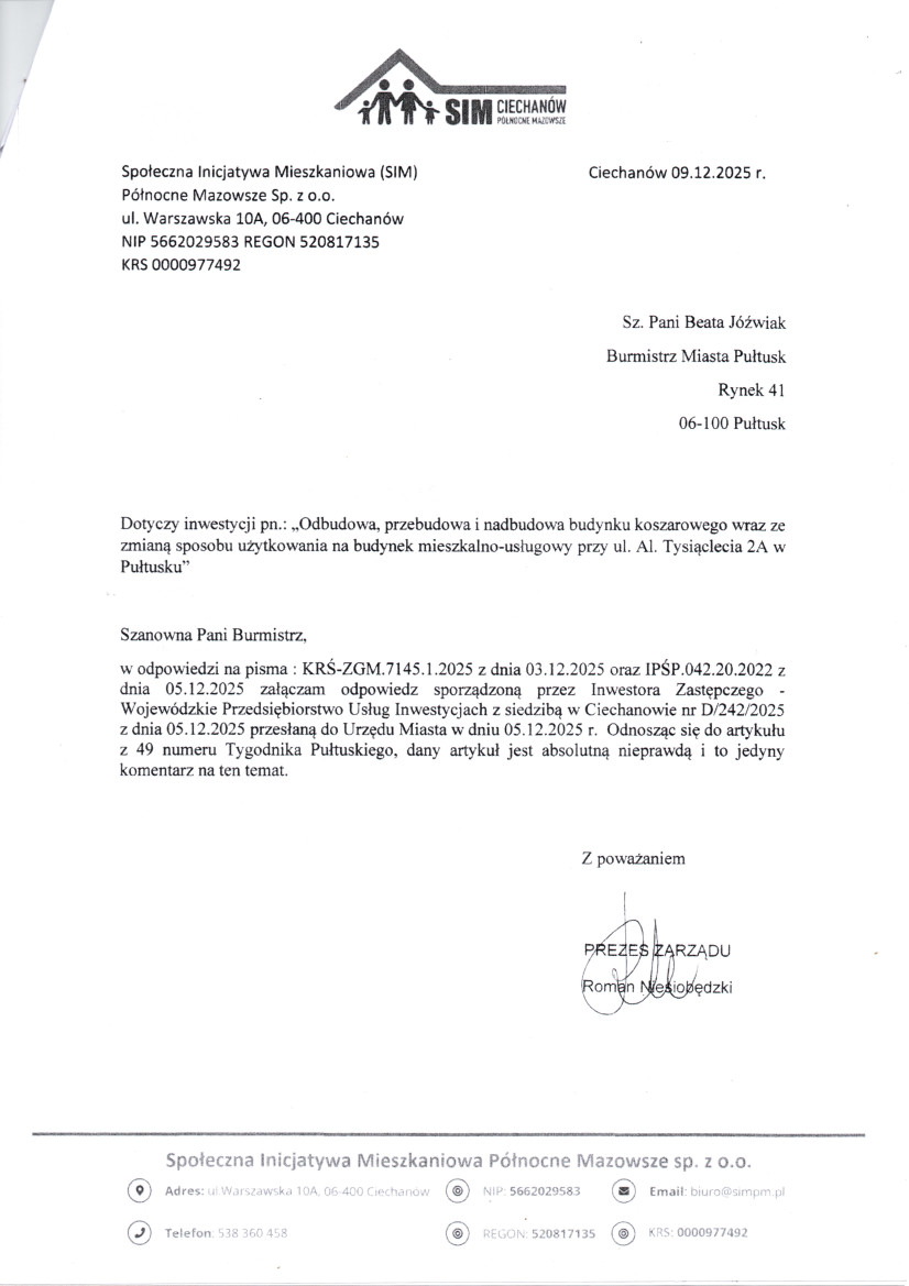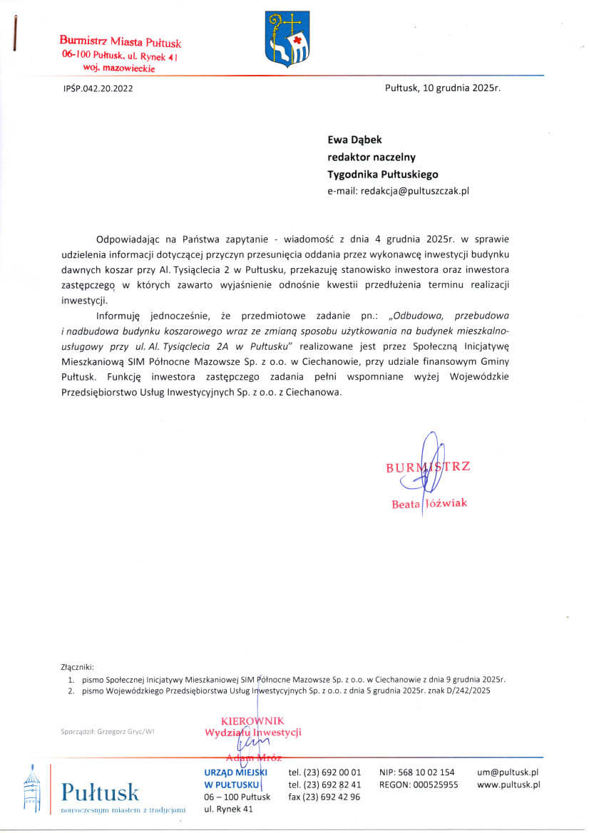 Panie sygnalisto od niepokojących plotek, na pytanie,"Co się dzieje przy ul. Tysiąclecia 2?" odpowiem ja, stała czytelniczka "Tygodnika Pułtuskiego". Pan już powiedział co pan wie, a ja wiem co mówię. Pułtusk to jedno z najstarszych miast Mazowsza. Prawa miejskie otrzymał od Księcia Siemowita w 1257r. Jego jednym z najbardziej charakterystycznych elementów zabudowy jest zespół koszarowy z około 1800-1880 roku. Dla mnie to "Wenecja Mazowsza", Miasto ze wspomnień z dziecięcych lat. To nie tylko zwykłe mury, ja kocham to miasto. Będę broniła dobrego imienia tego miejsca i tej inwestycji. Dodatkowo, wiedza na temat budownictwa nie jest mi obca. Uczestniczyłam przy budowie milionowych inwestycji, przy współpracy takich wykonawców jak INSTAL Lublin, czy MOSTOSTAL Poznań.