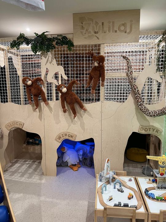 Przykłady ulubionych przez dzieci zabawek mogę mnożyć, choćby huśtawki, które zazwyczaj możemy spotkać jedynie na otwartych placach zabaw, a w ZuliLaj huśtawek mamy kilka. Co warte podkreślenia, całe wyposażenie ZuliLaj, począwszy od najdrobniejszych zabawek sensorycznych, skończywszy na rozbudowanych urządzeniach, jak choćby duża zjeżdżalnia rolkowa, posiada wymagane certyfikaty. Większość wyposażenia ZuliLaj zdecydowanie wykracza ponad proste określenie "zabawka": mamy maglownicę, mamy szarfę na której dzieci bardzo często się bujają relaksując się i wyciszając. Mamy mnóstwo zestawów tematycznych, gdzie maluchy mogą wcielać się w różne role: na przykład prowadzić sklep czy naprawiać samochód w warsztacie. Sala wyposażona jest w trzy "jaskinie" noszące nazwy: słuch ,dotyk i wzrok, w których dzieci rozwijają wyobraźnię, stymulują wszystkie zmysły.
