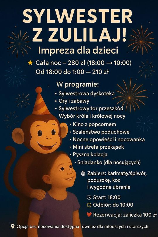ZL: Jak wspomniałam wcześniej, najbliższa impreza to Sylwester z ZuliLaj. Zaczynamy w sylwestrowy wieczór o godzinie 18:00, kończymy w Nowy Rok o 10:00. Postanowiłam dać maluchom ten wyjątkowy czas tak, aby okazał się dla nich cudowny, zabawowy, wyjątkowy, taki, żeby długo tego sylwestra wspominały. A dorosłym daję alternatywę – niech dzieciaki poczują magię sylwestrowej nocy, a rodzice nie muszą już zastanawiać się, idąc na bal czy domówkę, którym dziadkom powierzyć swoje pociechy na tę noc. Jakie sylwestrowe atrakcje? Będzie dyskoteka, mnóstwo przemyślanych gier i zabaw, będzie tor przeszkód, wybory królowej i króla balu. Zaplanowałam kino z popcornem i wspólnie wybierzemy familijne filmy adresowane do dzieci. Oczywiście przyjdzie czas na odpoczynek i sen – ale z pewnością łatwiej się zasypia po bitwie na poduszki. Będą nocne opowieści, wszyscy sobie usiądziemy w kółku i będziemy trzymać latarkę, która stanie się też przechodnim mikrofonem i będziemy opowiadać ciekawe historie.