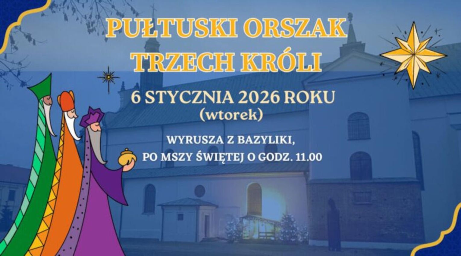 Serdecznie zapraszamy do udziału w Pułtuskim Orszaku Trzech Króli, który odbędzie się 6 stycznia 2026 roku (wtorek). Orszak wyruszy z Bazyliki po Mszy Świętej o godz. 11.00.