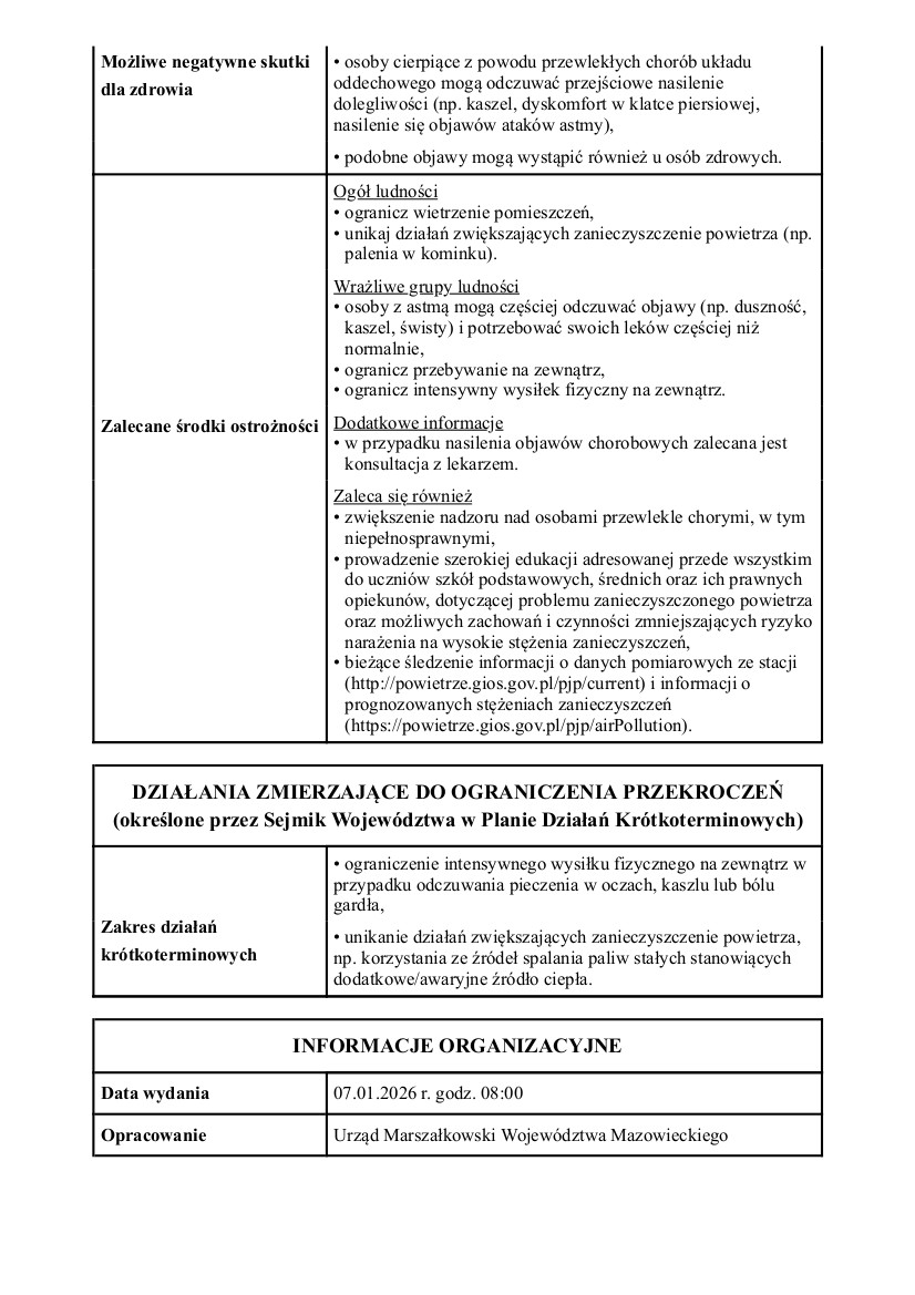 Powiadomienie o ryzyku wystąpienia przekroczenia średniodobowego poziomu dopuszczalnego dla pyłu zawieszonego PM 10 w powietrzu dla powiatu pułtuskiego.