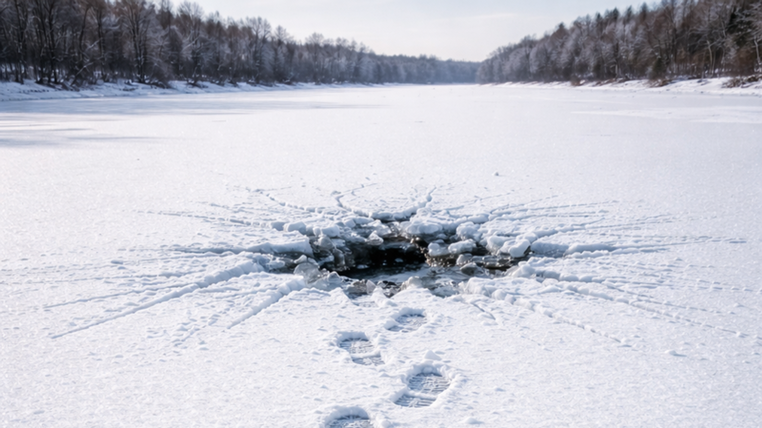 Nawet jeśli lód wydaje się gruby, równy i stabilny, nie masz żadnej pewności, co dzieje się pod powierzchnią. Wystarczy jeden krok w złym miejscu, by tafla pękła, a Ty znajdziesz się w lodowatej wodzie. To realne zagrożenie życia.