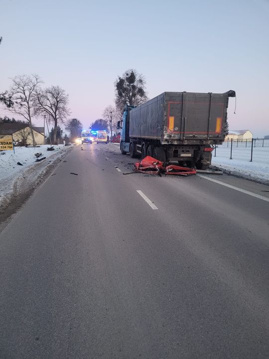 Do wypadku komunikacyjnego z udziałem zespołu pojazdów w postaci ciągnika siodłowego z naczepą oraz samochodu marki Opel doszło w dniu 2 lutego 2026r. o godz. 6:25, w miejscowości Chyliny, gm. Szelków na drodze powiatowej. Na skutek wypadku śmierć na miejscu zdarzenia poniosły 3 osoby. Byli to pasażerowie samochodu Opel, kobiety w wieku 40 i 65 lat oraz mężczyzna w wieku 49 lat, mieszkańcy powiatu makowskiego. Samochód marki Opel realizował przewóz medyczny osób do szpitala w Makowie Mazowieckim. Bus przystosowanym do przewozu osób niepełnosprawnych, a pacjenci jechali na dializy. Wstępnie ustalono, że na prostym odcinku drogi samochód Opel uderzył w lewą tylną część naczepy samochodu ciężarowego. Ciężarówka była zaparkowana częściowo na utwardzonym prawym poboczu, a częściowo na prawym pasie jezdni. Następnie odbił się od naczepy, zjechał na prawe pobocze i uderzył w drzewo. Kierowca samochodu Opel z obrażeniami ciała został przewieziony do szpitala. Na chwilę obecną nie są znane rokowania co do jego stanu zdrowia. Kierowca zespołu pojazdów nie był obecny w chwili zdarzenia. Około godziny 4.00, z uwagi na awarię pojazdu, pozostawił go na drodze i udał się do domu. Ze wstępnych ustaleń wynika, że stojąca na drodze naczepa nie była prawidłowo oznaczona trójkątem ostrzegawczym. W chwili wykonywania czynności na miejscu zdarzenia kierowcy obydwu pojazdów byli trzeźwi.
