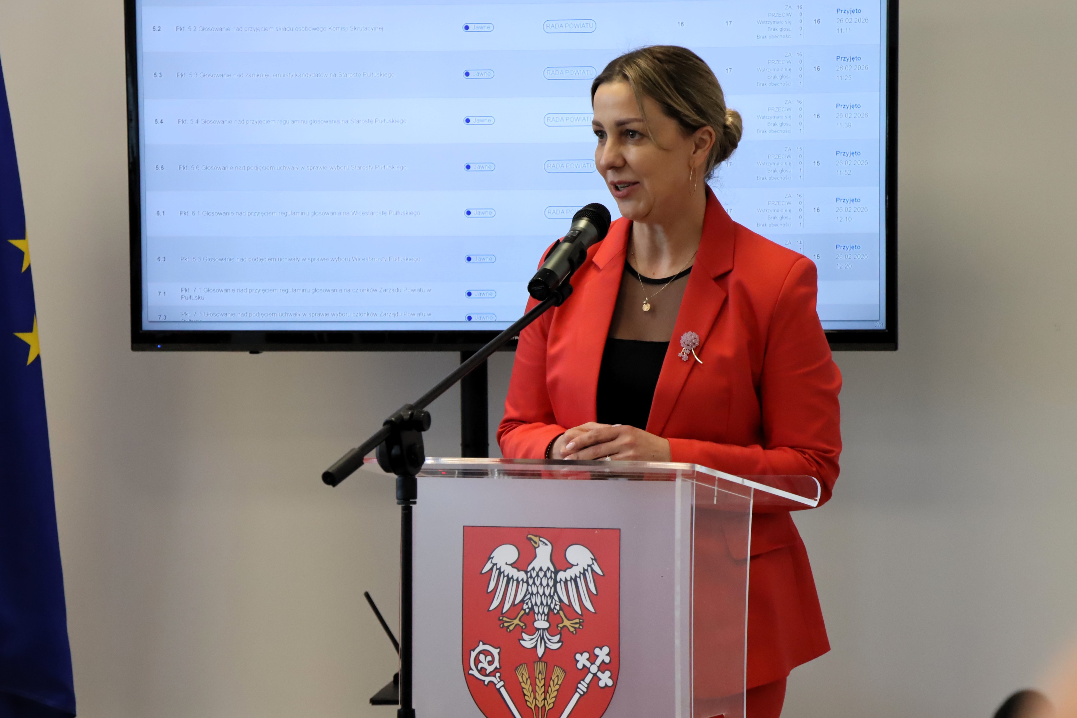 Kolejnym punktem porządku obrad było przyjęcie uchwały o wyborze Wicestarosty Pułtuskiego. Tę funkcje będzie pełnić radna Emilia Agata Gąsecka, której kandydaturę zgłosił Starosta Pułtuski Robert Czyżewski.