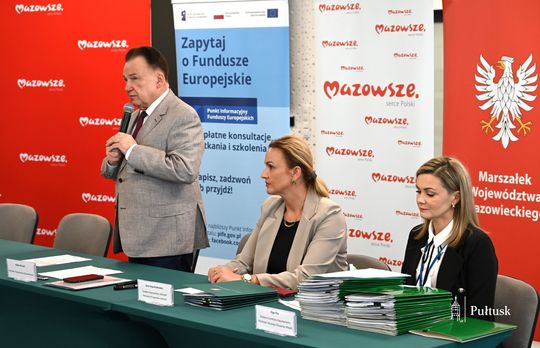 16 kwietnia 2026 r. Burmistrz Miasta Pułtusk Beata Jóźwiak oraz Skarbnik Miasta Pułtusk Lidia Dworecka podpisały z Marszałkiem Województwa Mazowieckiego Adamem Struzikiem umowy o dofinansowanie w ramach programu „Mazowsze dla sołectw 2026”.